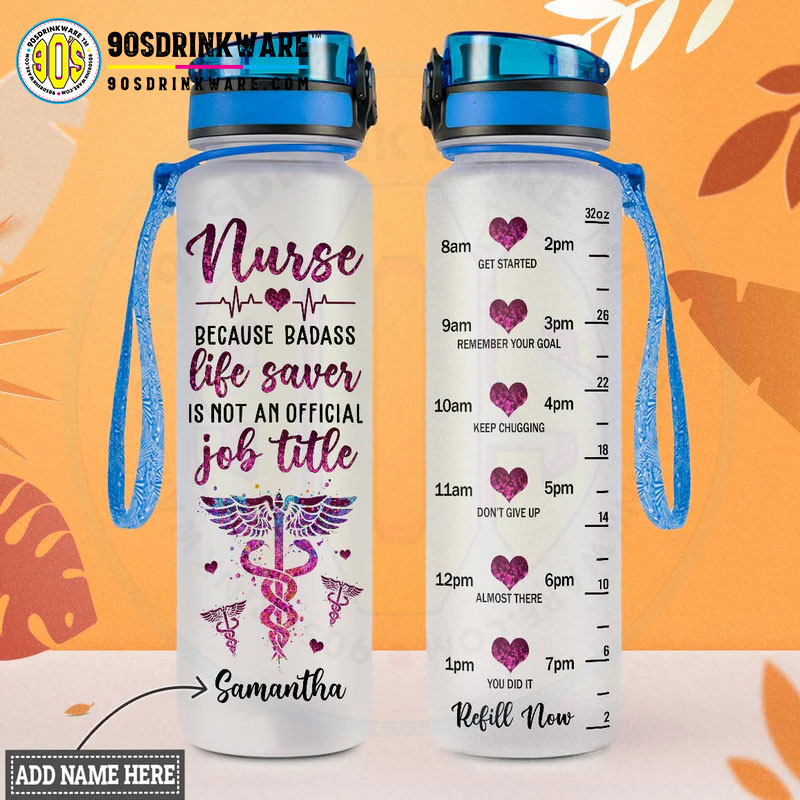 Stay hydrated and show off your nurse pride with the Personalized Water Tracker Bottle for Nurses – Nurse Because Badass Life Saver Is Not An Official Job Title. This 32oz water bottle is designed with nurses in mind, combining motivation and functionality in a sleek and stylish package. The fun, personalized design and time markers will help you stay on track with your daily water intake while celebrating your hard work and dedication.